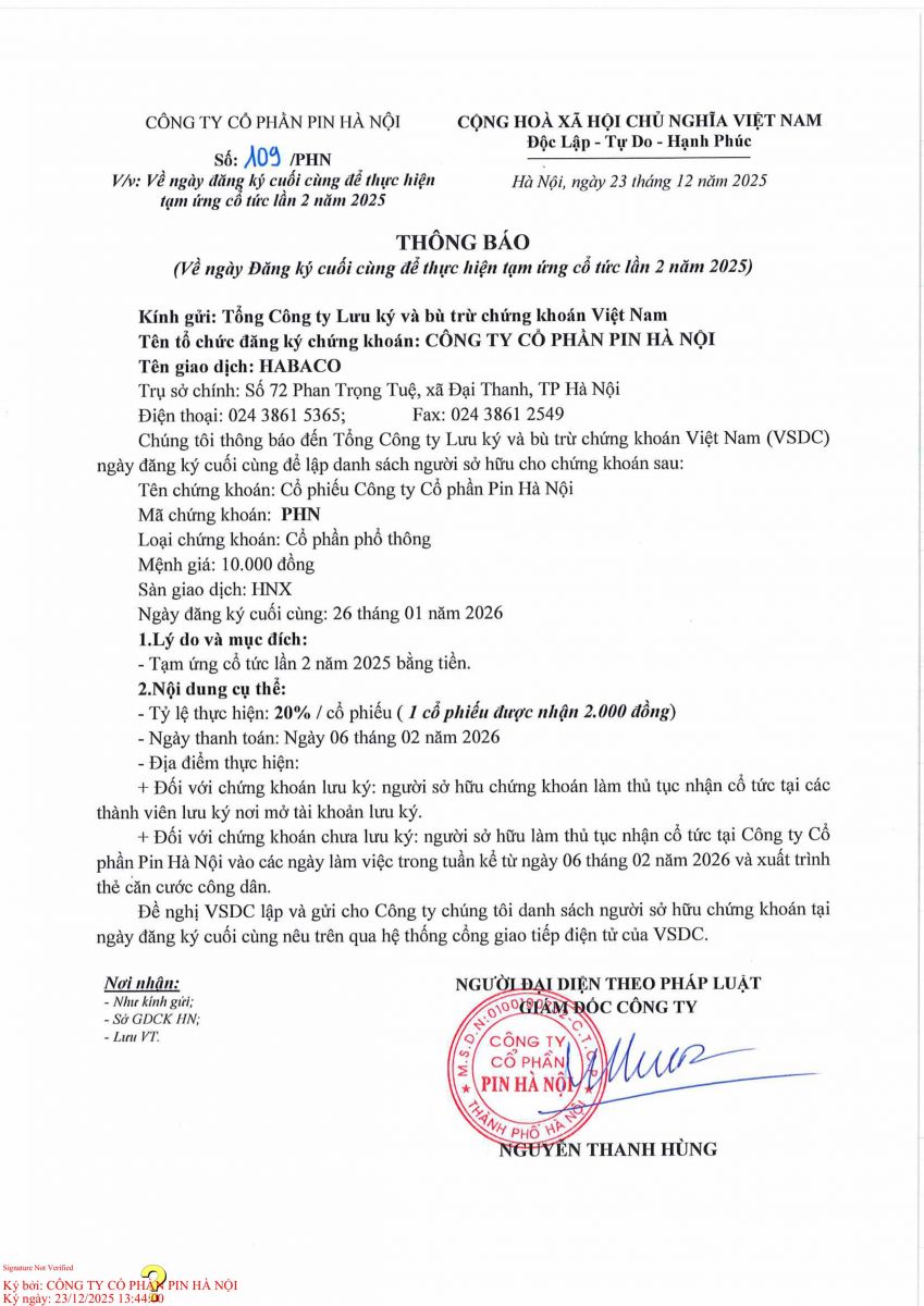 -  Thông Báo Chốt Danh Sách Cổ Đông Tạm Ứng Cổ Tức Lần 1 Năm 2025